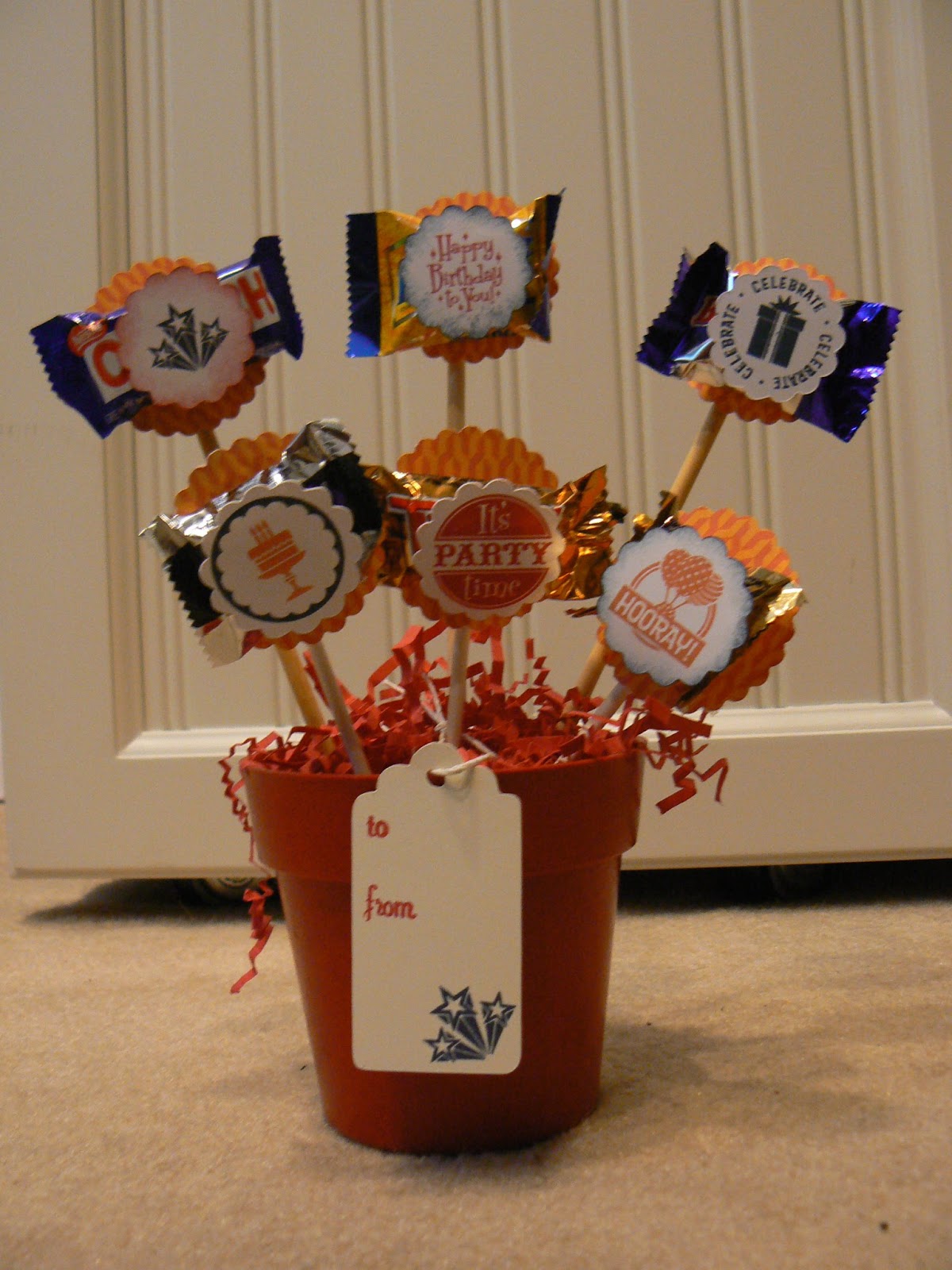 This month's theme was birthday, so I thought I'd pull a Flower's To Go candy type bouquet (instead of a flower arrangement) in a little flower pot. Ha Ha!!
